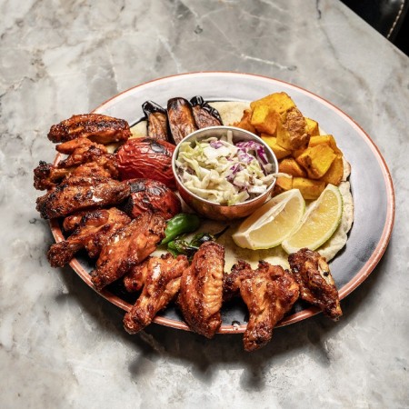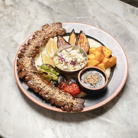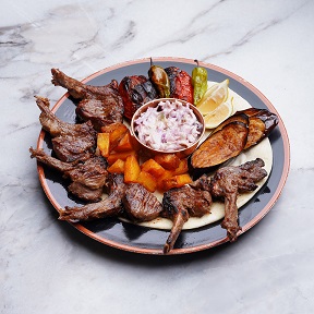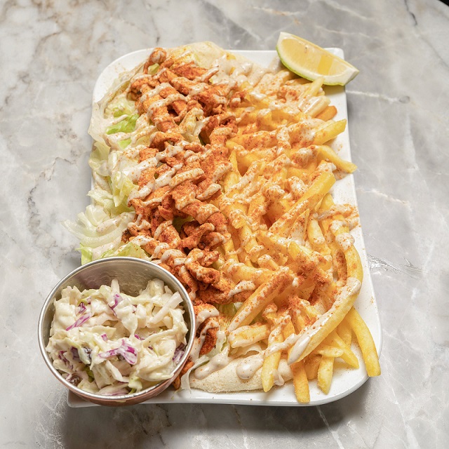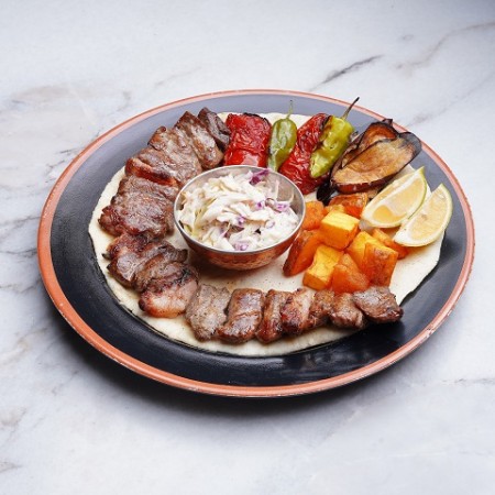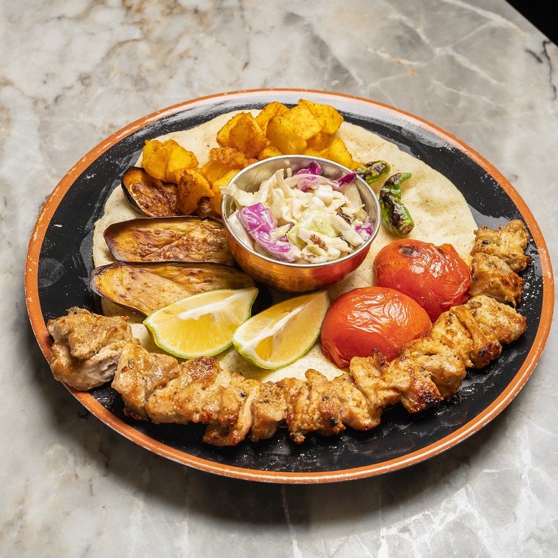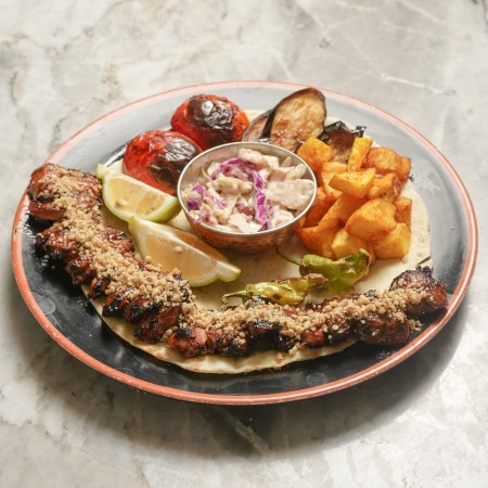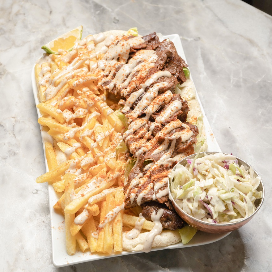 نان پیتا،سس تارتار،200گرم گوشت راسته گوساله مزه دار شده، کاهو،سیب زمینی،سس سیر،سالاد اندونزی