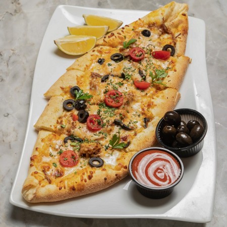 خمیر پیده،سس گوجه،گوشت رست بیف،گوجه اسلایس،پنیر مزه دار