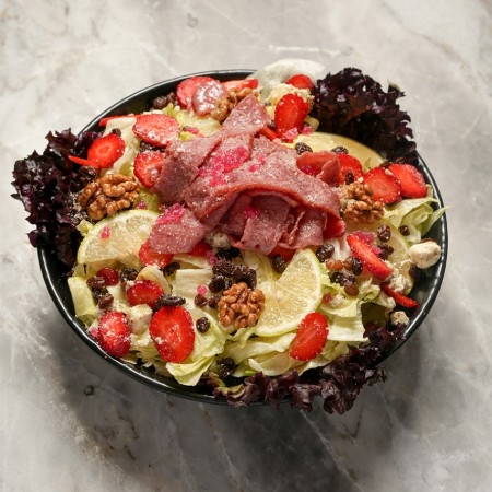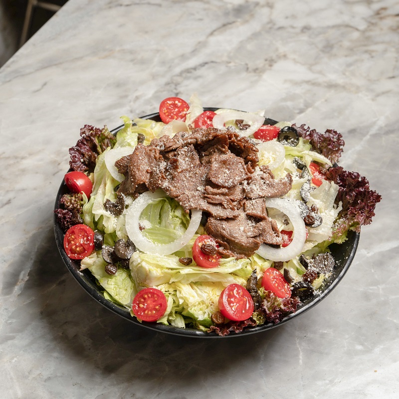 کاهو رسمی .کاهو فرانسوی .گوشت راسته گوساله مزه دار شده،زیتون .گوجه چری .کشمش .پیاز حلقه ای.پنیر پارمزان،سس اورینتال