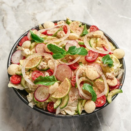 کاهو رسمی .تربچه .خیار.پیاز حلقه ای .گوجه چری . برگ نعنا.پنیر بلغاری.سماق،سس فتوش
