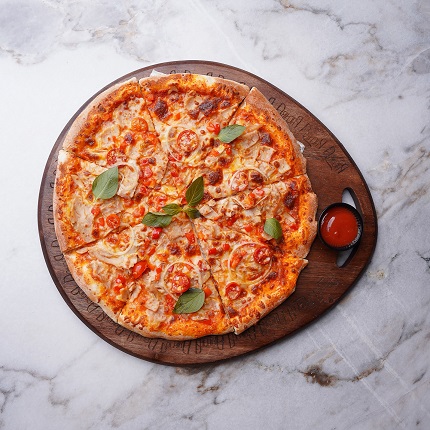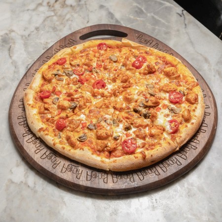 خمیر پیده،سس گوجه،مرغ ریش شده،گوجه اسلایس پنیر مزه دار