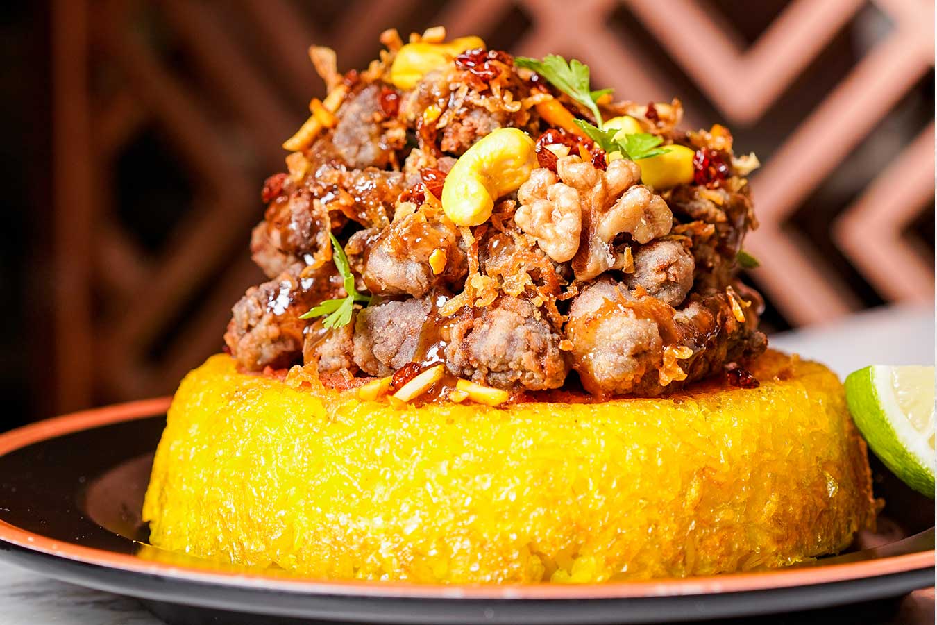 کته زعفرانی،سس گوجه 200گرم گوشت راسته گوسفندی مزه دار سوخاری شده،پیاز داغ،زرشک ،خلال بادام،آجیل بوداده،سس اورینتال