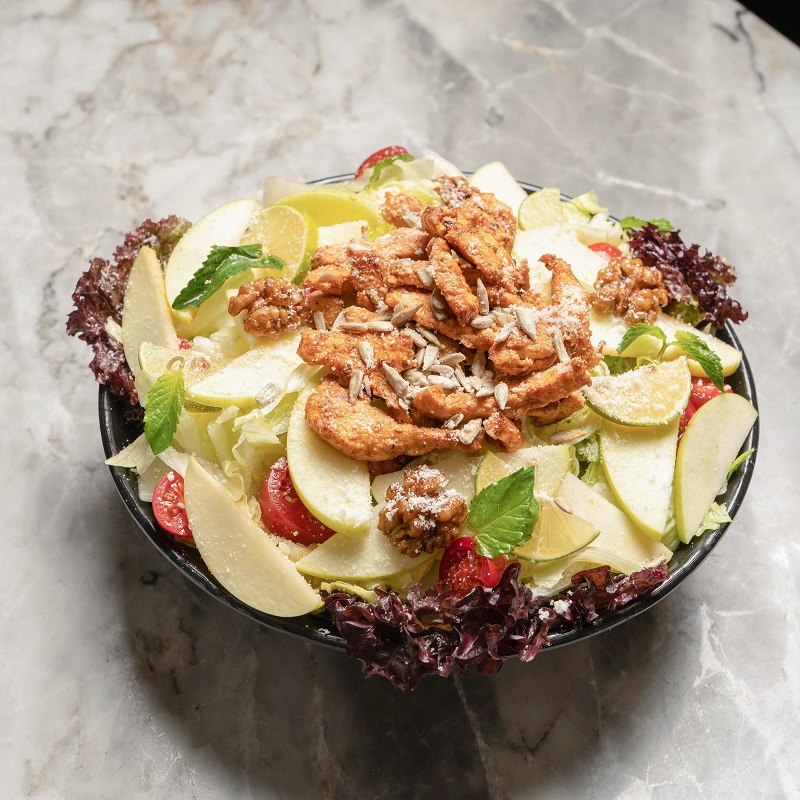 کاهو رسمی .کاهو فرانسوی.سینه مرغ مزه دار شده،لیمو .سیب درختی .مغز تخمه افتابگردان. گوجه چری .پنیر پارمزان.گردو کاراملی،سس بروسل