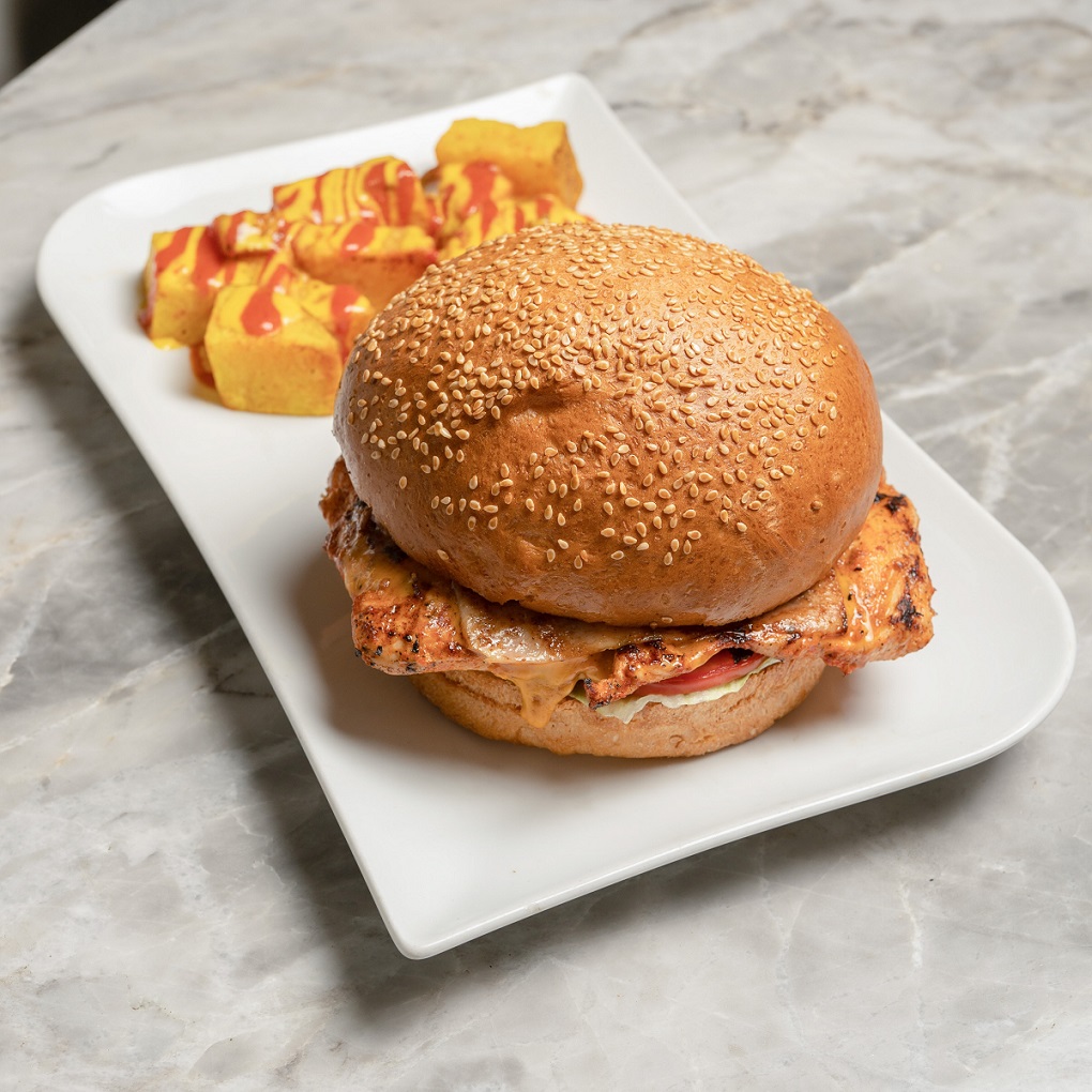 200گرم سینه مرغ مزه دار شده،سس بیگ بنگ ،سس تارتار،دیپ چدار،بیکن مرغ، کاهو،گوجه فرنگی، خیارشور،سیب زمینی